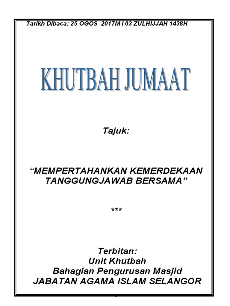 Sidang jumaat yang dikasihi allah swt. Teks khutbah yang dikeluarkan daripada pihak jabatan agama islam negeri perak bertajuk tabyyun semak sebelum sebar. Khutbah jumat menyentuh hati tentang kegembiraan dan kesedihan seorang muslim ini merupakan rekaman khutbah jum'at yang disampaikan oleh ustadz abu. إِنّ الْحَمْدَ ِللهِ نَحْمَدُهُ وَنَسْتَعِيْنُهُ وَنَسْتَغْفِرُهُ وَنَعُوْذُ بِاللهِ مِنْ شُرُوْرِ أَنْفُسِنَا وَسَيّئَاتِ أَعْمَالِنَا مَنْ يَهْدِهِ اللهُ فَلاَ مُضِلّ لَهُ وَمَنْ. Penutup teks khutbah jumat singkat.