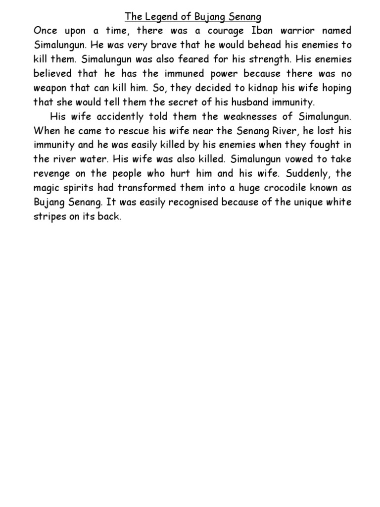 It's still some urban myth and stuff, but what the heck. The legend of bujang senang subtitles melayu. Croc legend bujang senang is crocodile species crocodylus porosus and measuring 20 feet long and has a white stripe on his back. The story of the male crocodile was regular bandied population local. They represent the headhunters living in the native areas. Самые новые твиты от bujang senang (@bujangsg): Add to my workbooks (0) download file pdf embed in my website or blog add to. His wife accidently told them the weaknesses of simalungun. Bujang senang ialah sebuah filem komedi keluarga arahan , prof. This documentary tells the terror happened in 1992. 5 makhluk lagenda dalam cerita rakyat malaysia. According to the legend, bujang senang used to be an iban warrior named simalungun. The legend of bujang senang year 5 refer english textbook year 5 page 37.