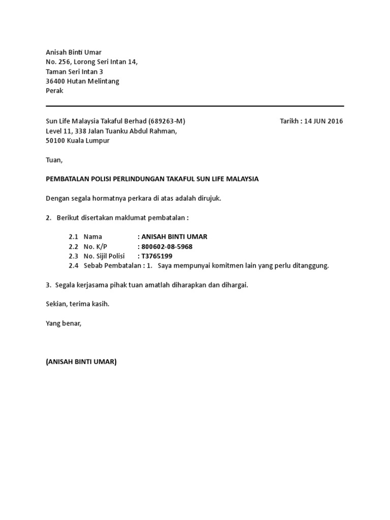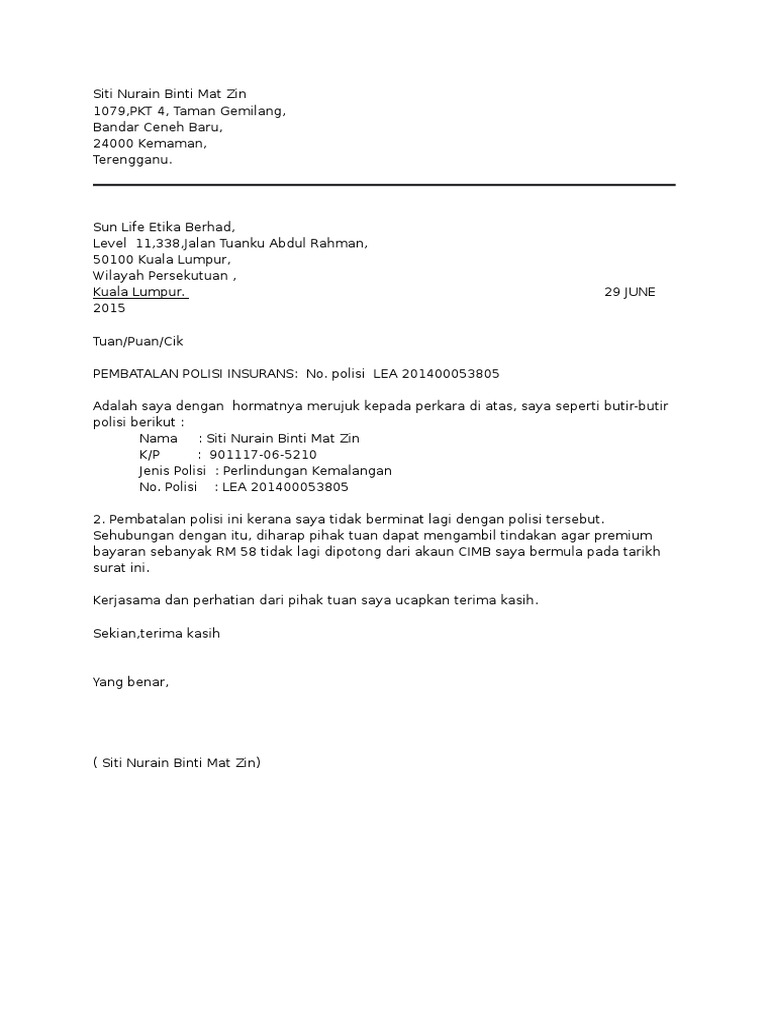 Surat Pembatalan Polisi Insurans Industri Insurans Di Malaysia from insurans-malaysia.com Hallo sahabat kbi, sahabat kbi pernah memesan suatu barang yang sahabat kbi inginkan? Example letter of termination of an insurance policy. Ea 4568 cie membawa alat berat beg hitachi z. Download & view contoh surat pembatalan polisi insurans as pdf for free. Kamu bisa sesuaikan isinya tergantung kebutuhan dan kondisi. Disini kami akan kupas tuntas seputar surat pemberitahuan dan kami juga akan berikan kepada anda contoh surat pemberitahuan yang baik dan benar. Pembatalan berlaku semasa tempoh polisi. Permohonan membatalkan polisi insurans takaful 1.