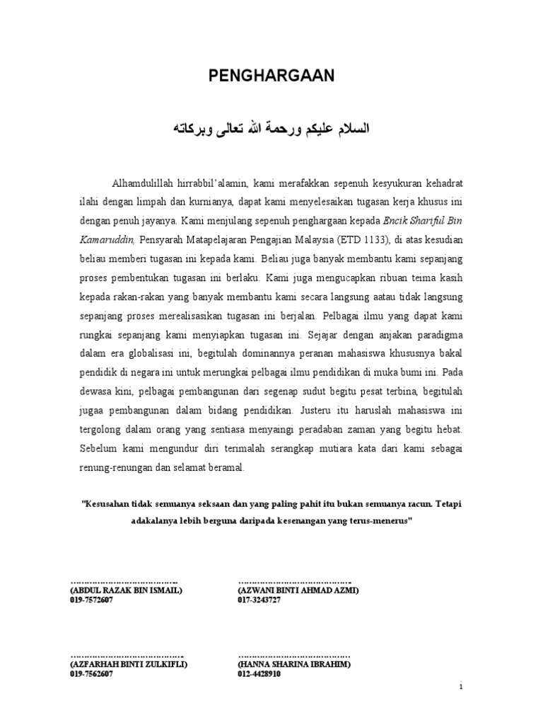 Penghargaan Folio from 0.academia-photos.com Pertamanya, saya ingin mendedikasikan ucapa penghargaan ini kepada pensyarah tercinta saya, en.nordin bin wan daud kerana dengan tunjuk ajar serta bimbingan daripadanya membuka ruang untuk saya menyiapkan tugasan ini dengan suksesnya. Contoh folio 1 penghargaan syukur alhamdulillah kepada allah s w t kerana dengan berkat dan keizinan dari nya maka saya telah dapat menyiapkan tugasan course hero Simpan contoh penghargaan untuk kerja kursus untuk nanti. Saya telah mendapat banyak manfaat dan sesuatu yang baru untuk dipelajari sepanjang proses menyiapkan tugasan projek bagi subjek edu 3053 teknologi dalam pengajaran dan pembelajaran ini. Penghargaan السل معليكمورحمةالتعالىوبركاته alhamdulillah hirrabbil'alamin, kami merafakkan sepenuh kesyukuran kehadrat ilahi dengan limpah dan kurnianya, dapat kami menyelesaikan tugasan kerja khusus ini dengan penuh jayanya. Contoh kertas kerja penubuhan persatuan di sekolah pdf 14% menganggap dokumen ini tidak bermanfaat, tandai dokumen ini sebagai tidak bermanfaat. Alhamdulillah, syukur kepada allah kerana dengan limpah kurnianya saya berjaya menyiapkan kerja kursus ini pada masa yang ditetapkan.